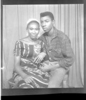 206. EAP449/2/18/206 Reference (shelfmark): EAP449/2/18/206 Title: A couple, a young girl sitting, wearing a full outfit and white headscarf and a young man wearing a grey shirt and black pants, facing forward. Collection Area: Endangered Archives Programme Languages: Not applicable Date Range: 2nd half od the 20th century Extent: 1 TIFF image