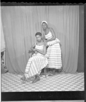 207. EAP449/2/18/207 Reference (shelfmark): EAP449/2/18/207 Title: Two ladies in the same outfits, one sitting with her arms crossed, wearing a necklace and earrings. The other lady standing, wearing a white headscarf, facing forward. Collection Area: Endangered Archives Programme Languages: Not applicable Date Range: 2nd half od the 20th century Extent: 1 TIFF image