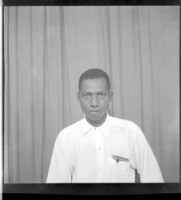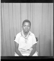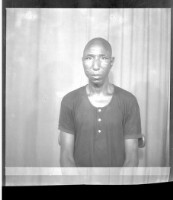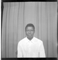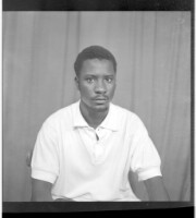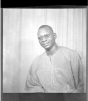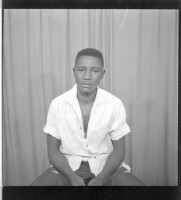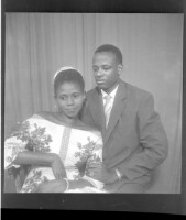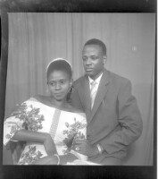 A couple; A women sitting, wearing a black and white dress, headscarf and earrings with her hair done and a man wearing a white shirt, black suit, pen in his pocket and a watch, facing the studio. (Double)