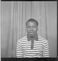 2 young men standing, on the left a man wearing a white long sleeved shirt, black pants and a watch. On the left, wearing a short sleeved shirt and black pants, facing the studio.