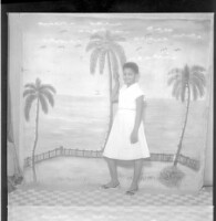 Full shot of a young girl standing, wearing a black and white dress and black shoes with a background with 3 palm trees, with her arms on her side, studio profile view.
