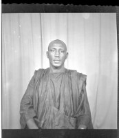 4 people, on the right a man wearing a black boubou and grey chechais, in the middle a women standing, wearing a camisole with a necklace and white headscarf. A little girl in a black boubou and a man on the right sitting, wearing a black and white boubou