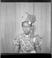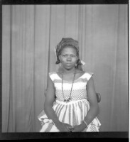 Full shot of 3 people, a women sitting, wearing a black dress, a necklace and a black headscarf with a baby boy on her lap wearing a black and white boubou. Also a young girl standing, wearing a full outfit with a white headscarf and necklace, facing the