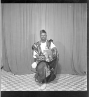 Full shot of a lady kneeling down and her baby. The lady wearing: a headscarf and earrings with her hair done and the baby sitting in the chair, facing the studio.