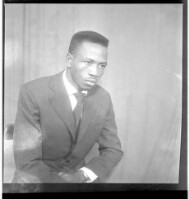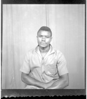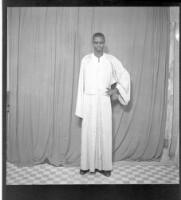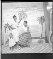 Full shot of 3 people, a young girl standing, wearing a white dress and a young girl sitting, wearing a white shirt and skirt with her hair done and a background with 3 palm trees in the back, facing the studio. (Double)