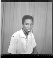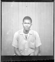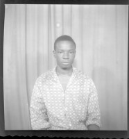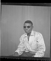 424. EAP449/2/18/424 Reference (shelfmark): EAP449/2/18/424 Title: A young man wearing a black and white shirt with glasses sitting face-forward in the studio. Collection Area: Endangered Archives Programme Languages: Not applicable Date Range: 2nd half od the 20th century Extent: 1 TIFF image