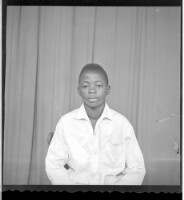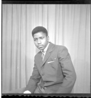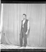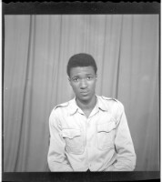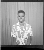 466. EAP449/2/18/466 Reference (shelfmark): EAP449/2/18/466 Title: A young man wearing a white and black t-shirt with a pen in the pocket, a watch, and black pants standing face-forward in the studio. Collection Area: Endangered Archives Programme Languages: Not applicable Date Range: 2nd half od the 20th century Extent: 1 TIFF image