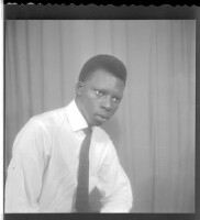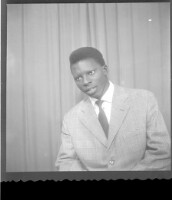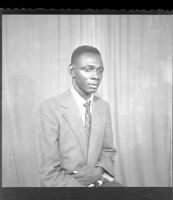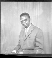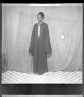 Two men standing in black boubous; the man on the right wearing a black chechais and glasses and the man on the left wearing a black chechais, facing forward. (Double)