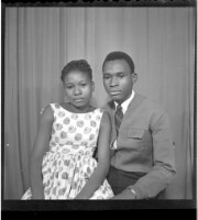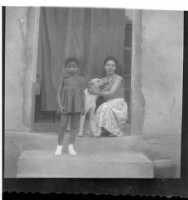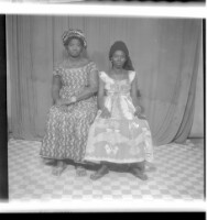 Two young girls wearing matching white dresses, the one on the right holding a guitar in her arms and smiling and the one on the left with her left hand on her hip, both standing face-forward in the studio.