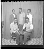 Five men, three wearing black suits and grey and black shirts standing and two wearing grey shirts and grey pants, the one on the left wearing a black and white shirt, all face-forward in the studio.
