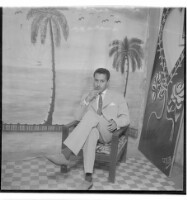 An Arab man wearing a suit sitting face-forward with his legs crossed in front of the tapestry with three palm trees and the Fin d'Annee (End of the Year) painting in the studio.