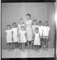 Five little girls wearing white dresses with a young girl standing in the middle wearing a dress with her hair styled, and three boys standing, the one on the right wearing a grey t-shirt and the other two wearing white shirts, all standing face-forward i