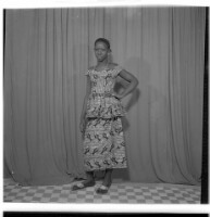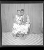 Three men, the one standing in the middle wearing a black boubou and black fez, with the other two wearing white boubous and black fezzes sitting, all face-forward in the studio.