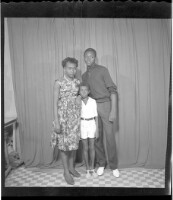 503. EAP449/2/18/503 Reference (shelfmark): EAP449/2/18/503 Title: A woman wearing a grey dress and white necklace with her hair styled standing next to a boy and a man wearing black, all standing face-forward in the studio. Collection Area: Endangered Archives Programme Languages: Not applicable Date Range: 2nd half od the 20th century Extent: 1 TIFF image