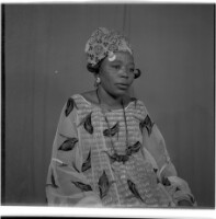 510. EAP449/2/18/510 Reference (shelfmark): EAP449/2/18/510 Title: A woman wearing a grey boubou and a head wrap with her hair styled in the studio. Collection Area: Endangered Archives Programme Languages: Not applicable Date Range: 2nd half od the 20th century Extent: 1 TIFF image