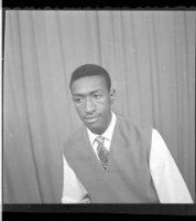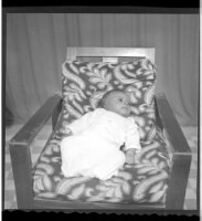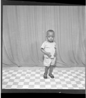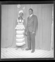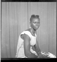 Two young girls wearing white dresses, one also wearing a necklace with her hair styled sitting face-forward and the other with her hair styled standing face-forward with her arms crossed in the studio.