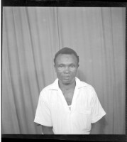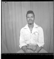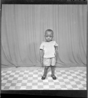A family photo of 5 people; two men wearing grey boubous and white fezzes, a little by wearing a shirt and grey shirts, and two other men wearing black suits, the one in the middle wearing a black shirt, all face-forward in the studio.