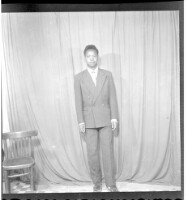 648. EAP449/2/18/648 Reference (shelfmark): EAP449/2/18/648 Title: A man wearing a black suit standing face-forward with an empty chair in the studio. Collection Area: Endangered Archives Programme Languages: Not applicable Date Range: 2nd half od the 20th century Extent: 1 TIFF image