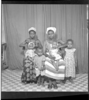 Photo of two women wearing dresses and headscarves with four children. Two infants on their laps, one little boy standing in the middle wearing a short sleeved shirt and shorts, and one little girl next to them wearing a white dress in the studio.