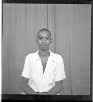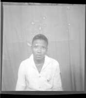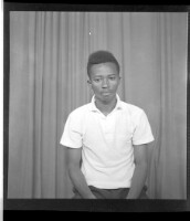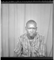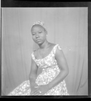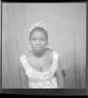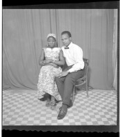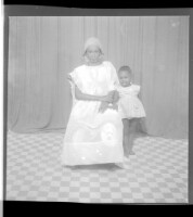 A young girl wearing a dress, head wrap, and earrings sitting face-forward with her arms crossed on a chair with a man wearing a white shirt, black pants, and black shoes sitting face-forward in the studio.