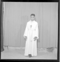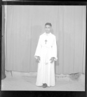 63. EAP449/2/18/63 Reference (shelfmark): EAP449/2/18/63 Title: A young man standing with a white boubou and a cross necklace, facing forward. Collection Area: Endangered Archives Programme Languages: Not applicable Date Range: 2nd half od the 20th century Extent: 1 TIFF image