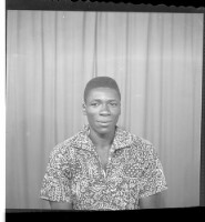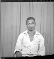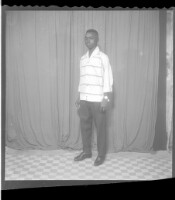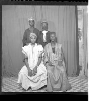 Two men wearing black boubous and fezzes standing face-forward and two other men wearing white and grey boubous, watches, and amulets sitting face-forward in the studio.
