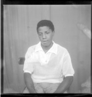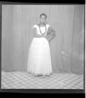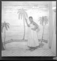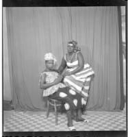 A woman wearing a camisole, black pagne, and head wrap sitting face-forward on a chair with her arms crossed and another woman wearing a camisole and necklace standing face-forward with her foot on the chair in the studio.