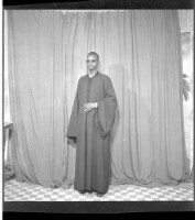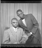 Full shot of two people: a man sitting in a chair playing a guitar and wearing a black boubou and grey Fez, and another man standing wearing a black boubou and black Fez in the studio.