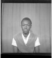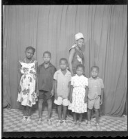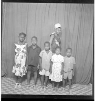 Full shot of a family of six: a woman standing in profile wearing a camisole, white headscarf, necklace, and earrings, two girls wearing dresses and three boys in shirts and shorts from shortest to tallest in the studio.