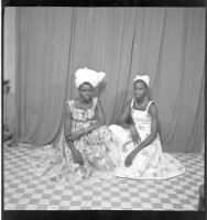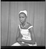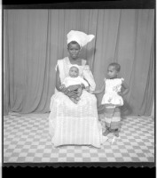 A woman sitting wearing a white boubou and headscarf, earrings, and with a baby wearing all white and a little girl in a camisole and pagne in the studio.