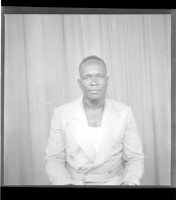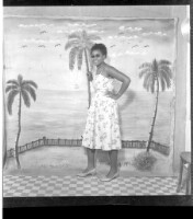 789. EAP449/2/18/789 Reference (shelfmark): EAP449/2/18/789 Title: A young girl standing wearing a dress, black glasses, left arm on her hip, smiling with a curtain behind her decorated with three palm trees. Collection Area: Endangered Archives Programme Languages: Not applicable Date Range: 2nd half od the 20th century Extent: 1 TIFF image