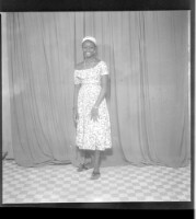 A couple; A young man sitting in a chair wearing a long sleeve white shirt and a young girl in a white dress with a necklace, earrings and hair done, facing forward.