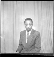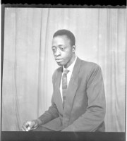 A man standing wearing a white long sleeve shirt, black tie and hat playing a trumpet with a drape background with 3 palm trees, facing forward. (Double)