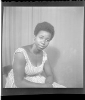 806. EAP449/2/18/806 Reference (shelfmark): EAP449/2/18/806 Title: A woman sitting in a chair wearing a grey dress, large hairstyle, and arms crossed in the studio. Collection Area: Endangered Archives Programme Languages: Not applicable Date Range: 2nd half od the 20th century Extent: 1 TIFF image