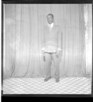 807. EAP449/2/18/807 Reference (shelfmark): EAP449/2/18/807 Title: Full shot of a man standing wearing a white shirt and grey suit in profile in the studio. Collection Area: Endangered Archives Programme Languages: Not applicable Date Range: 2nd half od the 20th century Extent: 1 TIFF image