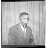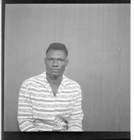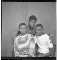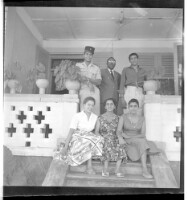 Three women, two of who wearing dresses and necklaces, are sitting full frontal view and one of who is wearing a shirt and skirt, sitting profile view. All three are in front of three men, one of who is wearing a suit, tie, and glasses; one of who is we