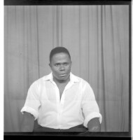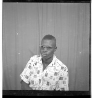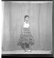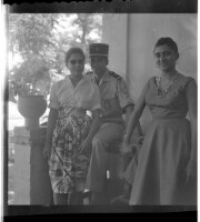 A woman wearing a shirt, skirt, and glasses, standing full frontal view, leaning on a man in a military uniform who is sitting full frontal view next to a woman wearing a dress and necklace, standing profile view on a terrace of a house, next to a potte