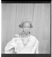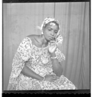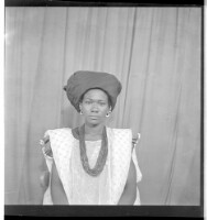 134. EAP449/2/19/134 Reference (shelfmark): EAP449/2/19/134 Title: A woman wearing a loose dress, a headscarf, and necklaces, sitting full frontal view in the studio. Collection Area: Endangered Archives Programme Languages: Not applicable Date Range: 2nd half od the 20th century Extent: 1 TIFF image