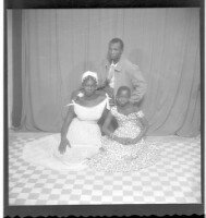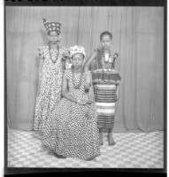 137. EAP449/2/19/137 Reference (shelfmark): EAP449/2/19/137 Title: A woman wearing a dress, headscarf, and necklaces, sitting full frontal view in front of two women wearing pagne dresses (wrapper dresses) and necklaces, all standing full frontal view in the studio. Collection Area: Endangered Archives Programme Languages: Not applicable Date Range: 2nd half od the 20th century Extent: 1 TIFF image