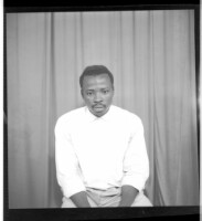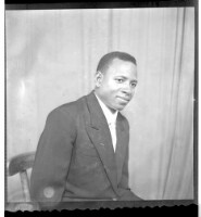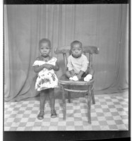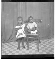 A little girl wearing a dress and necklace, standing full frontal view next to a little boy wearing a t-shirt and socks, sitting full frontal view on a chair, in the studio.