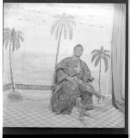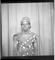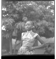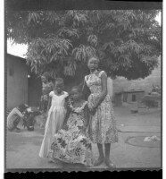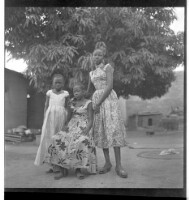 A girl wearing a dress, sitting full frontal view in between of two girls wearing dresses, standing full frontal view in front of a mango tree in the courtyard of a house in the presence of several people.