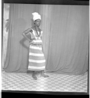 170. EAP449/2/19/170 Reference (shelfmark): EAP449/2/19/170 Title: A woman wearing a robe pagne (wrapper dress) and necklaces standing profile view in the studio. Collection Area: Endangered Archives Programme Languages: Not applicable Date Range: 2nd half od the 20th century Extent: 1 TIFF image