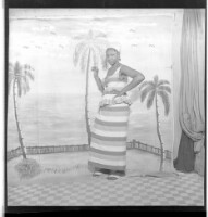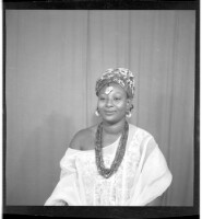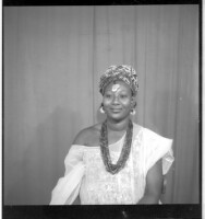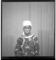 176. EAP449/2/19/176 Reference (shelfmark): EAP449/2/19/176 Title: A woman wearing a robe pagne (wrapper dress) and necklace standing profile view in the studio. Collection Area: Endangered Archives Programme Languages: Not applicable Date Range: 2nd half od the 20th century Extent: 1 TIFF image