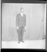 234. EAP449/2/19/234 Reference (shelfmark): EAP449/2/19/234 Title: A man wearing a suit and tie, standing profile view in the studio. Collection Area: Endangered Archives Programme Languages: Not applicable Date Range: 2nd half od the 20th century Extent: 1 TIFF image