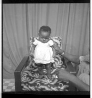 242. EAP449/2/19/242 Reference (shelfmark): EAP449/2/19/242 Title: A baby girl wearing a dress, standing full frontal view on a chair, but held up by a non-identified individual, taken in the studio. Collection Area: Endangered Archives Programme Languages: Not applicable Date Range: 2nd half od the 20th century Extent: 1 TIFF image