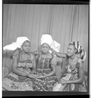 244. EAP449/2/19/244 Reference (shelfmark): EAP449/2/19/244 Title: Three women wearing robes pagnes (wrapper dresses), head scarves, and necklaces. All sitting, one of whom is sitting full frontal view, and the others are sitting profile view in the studio. Collection Area: Endangered Archives Programme Languages: Not applicable Date Range: 2nd half od the 20th century Extent: 1 TIFF image