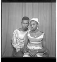 276. EAP449/2/19/276 Reference (shelfmark): EAP449/2/19/276 Title: A man wearing a shirt and chain necklace, sitting full frontal view next to a girl wearing a robe pagne (wrapper dress), head scarf, and chain necklace, sitting profile view in the studio. Collection Area: Endangered Archives Programme Languages: Not applicable Date Range: 2nd half od the 20th century Extent: 1 TIFF image