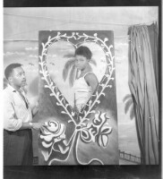 A man wearing a shirt and pants, standing profile view next to a woman wearing a tank top and necklace, standing profile view behind a frame in the studio.