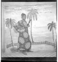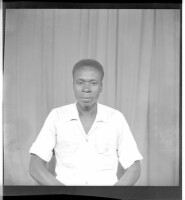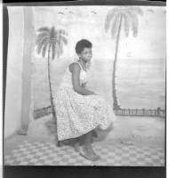A man wearing a shirt and pants, next to a woman wearing a pagne (wrapper dress) and a head scarf, holding a baby and sitting profile view in the studio.