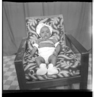 310. EAP449/2/19/310 Reference (shelfmark): EAP449/2/19/310 Title: A baby wearing a t-shirt, shorts, and a hat, sitting profile view in a chair. Collection Area: Endangered Archives Programme Languages: Not applicable Date Range: 2nd half od the 20th century Extent: 1 TIFF image